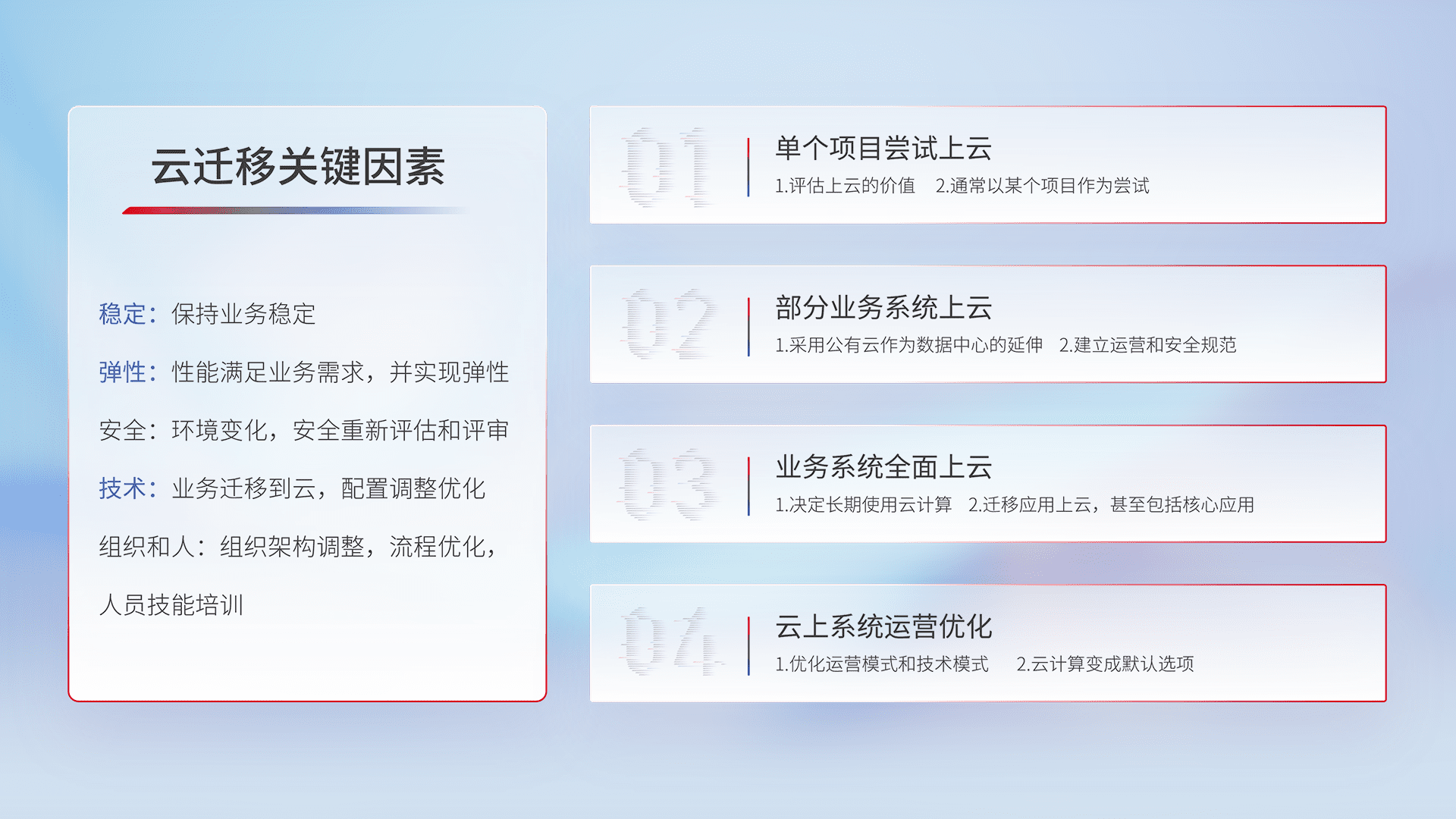 结合实际业务,,,从规划设计、、云平台选型、、云原生改造、、、、数据迁移、、集成交付,,,,迁移全过程为客户识别最佳上云路径,,,做好风险识别管理,,,设计网络架构、、、、身份权限、、安全审计合规、、、操作审计、、日志审计、、监控告警策略、、、多站点容灾设计等,,,对云上基础设施进行整体规划,,,提升IT治理水平,,,以满足弹性、、高可用、、、高性能的需求。。。