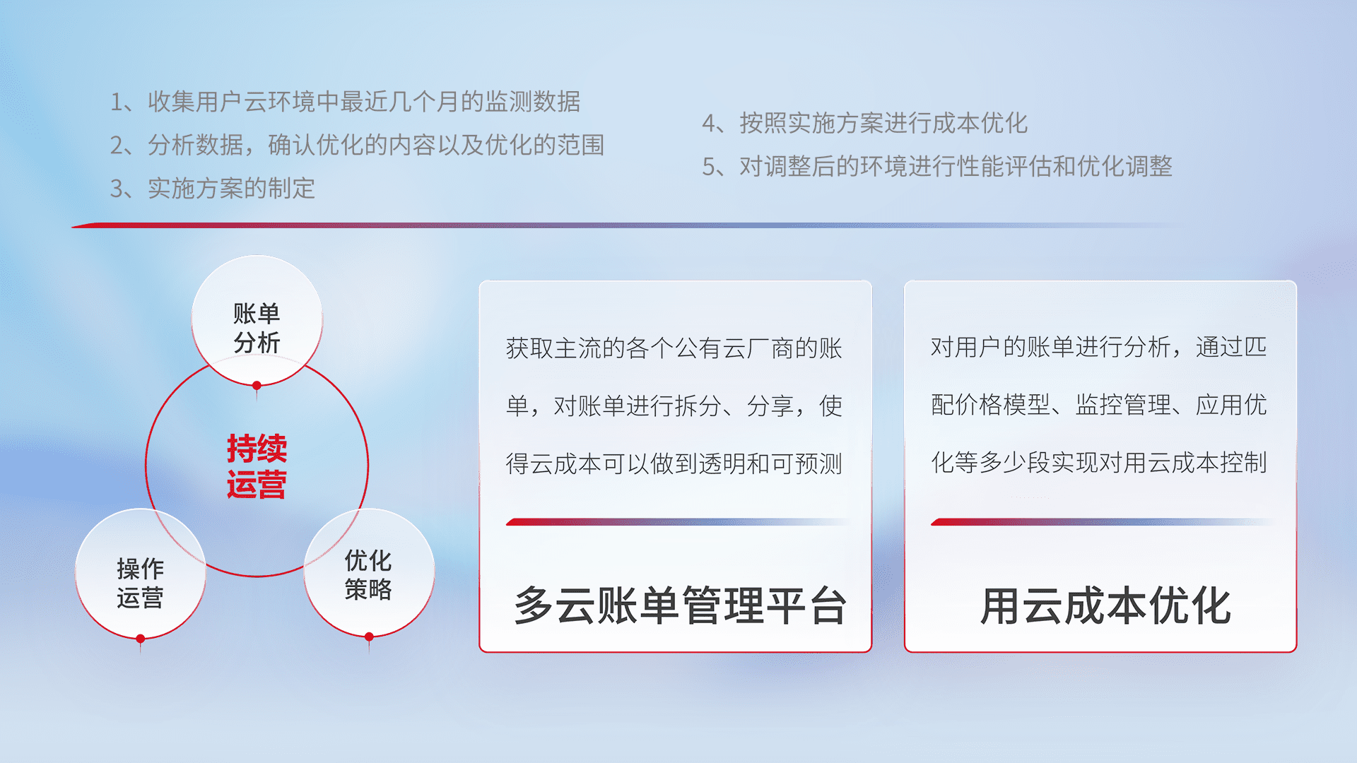 通过多云纳管,,,以统一的资源数据模型把客户的云资源进行抽象和封装,,进而实现对多云资源的统一操作,,,,保障云资源管理的可靠性、、、、稳定性与可用性。。。量身定制化运维内容,,配置、、、开发运维、、补丁管理、、、、备份、、、、监控、、认证和访问管理、、、、审计和日常巡检等,,,,保障在用云过程中的可靠度,,稳定度以及高可用率。。。。